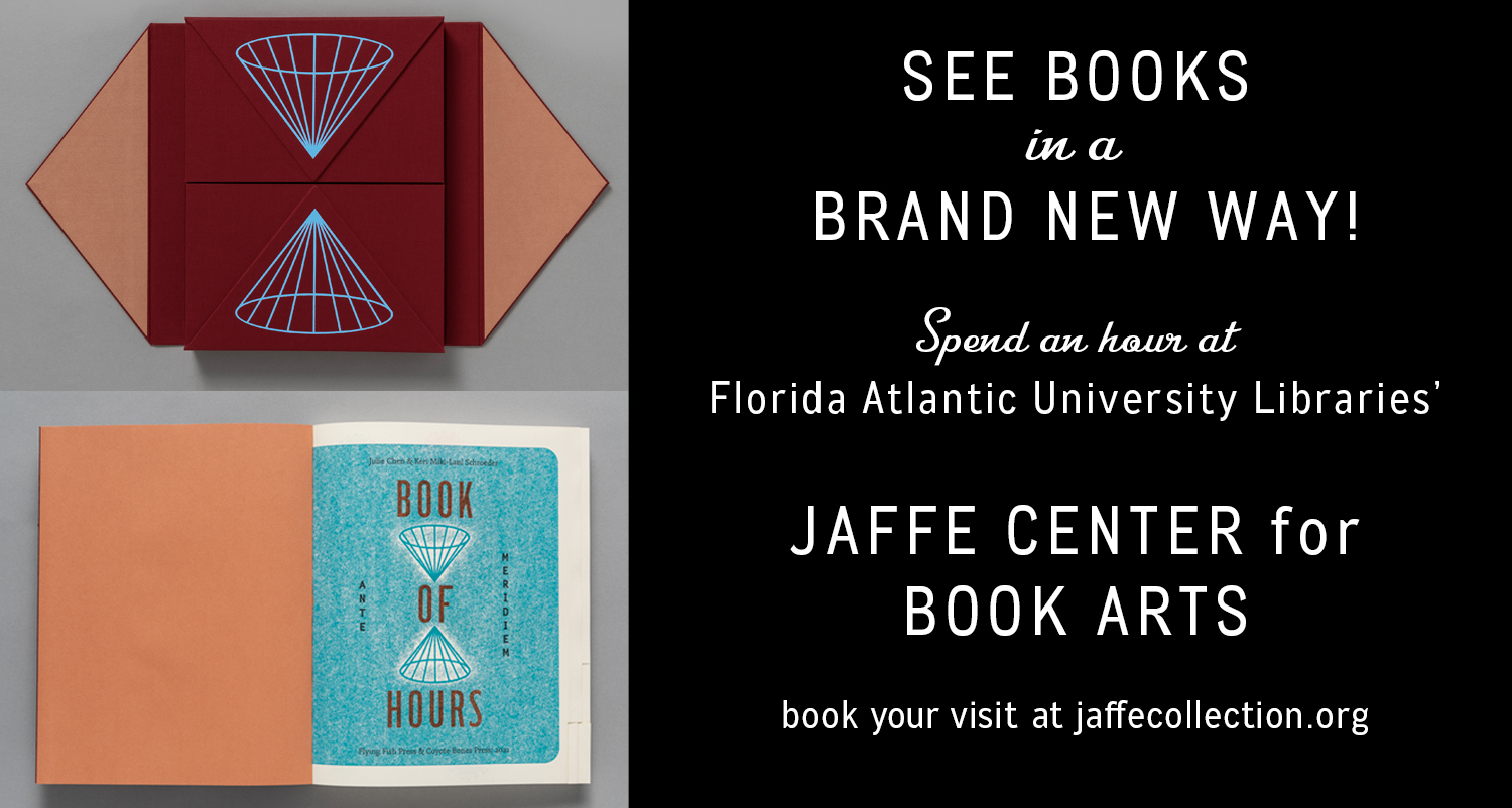 Come to JCBA to experience books like you've never seen before. We welcome community groups, classes from Florida Atlantic and other universities and colleges, groups of friends and family, professional groups, and classes from high schools and middle schools and elementary schools. Schedule an hour with us and we'll open your eyes to a whole new way of thinking, where the ubiquitous becomes astounding. Groups of 8 to 24 are ideal, but we can bend the rules a bit in either direction. Contact us for more details or to schedule.